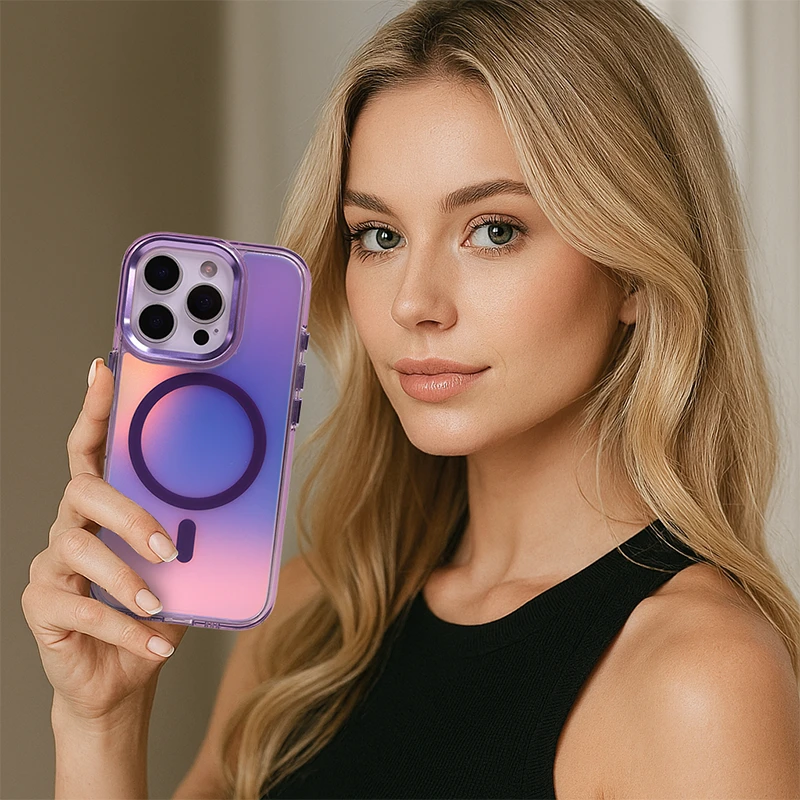 Under sunlight or indoors, the case reflects a range of colors: